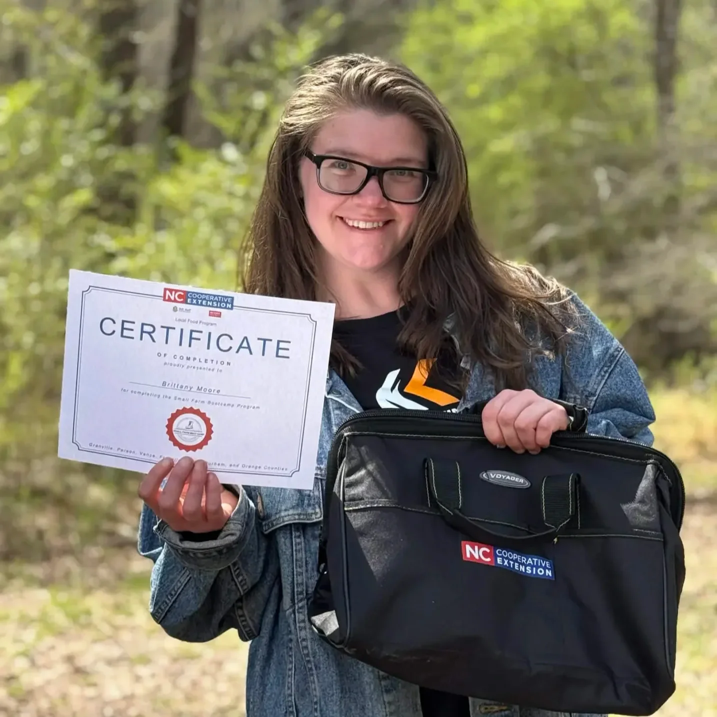Brittany of Myth and Oak Farm holding her Small Farm Bootcamp completion certificate at the N.C. Cooperative Extension Granville County Center.